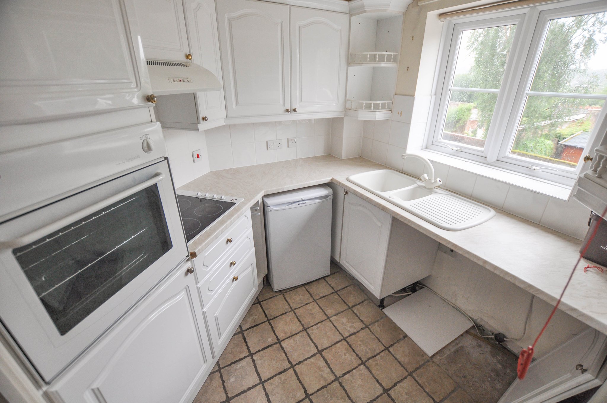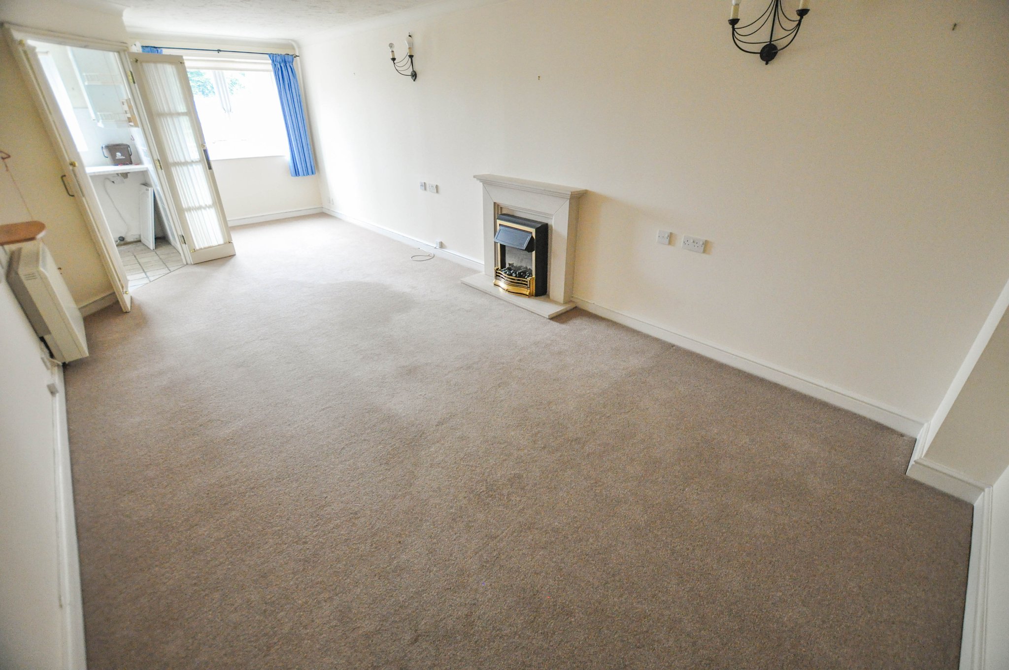 Flat 21 comprises a reception hall with storage and airing cupboards, a large lounge/dining room with polished stone decorative fireplace surround, electric fire, and glazed double doors to a modern fitted kitchen with Hygena electric oven, 4-ring ceramic hob and cooker hood. The main bedroom has built-in wardrobes, and there is a a second bedroom and bathroom.