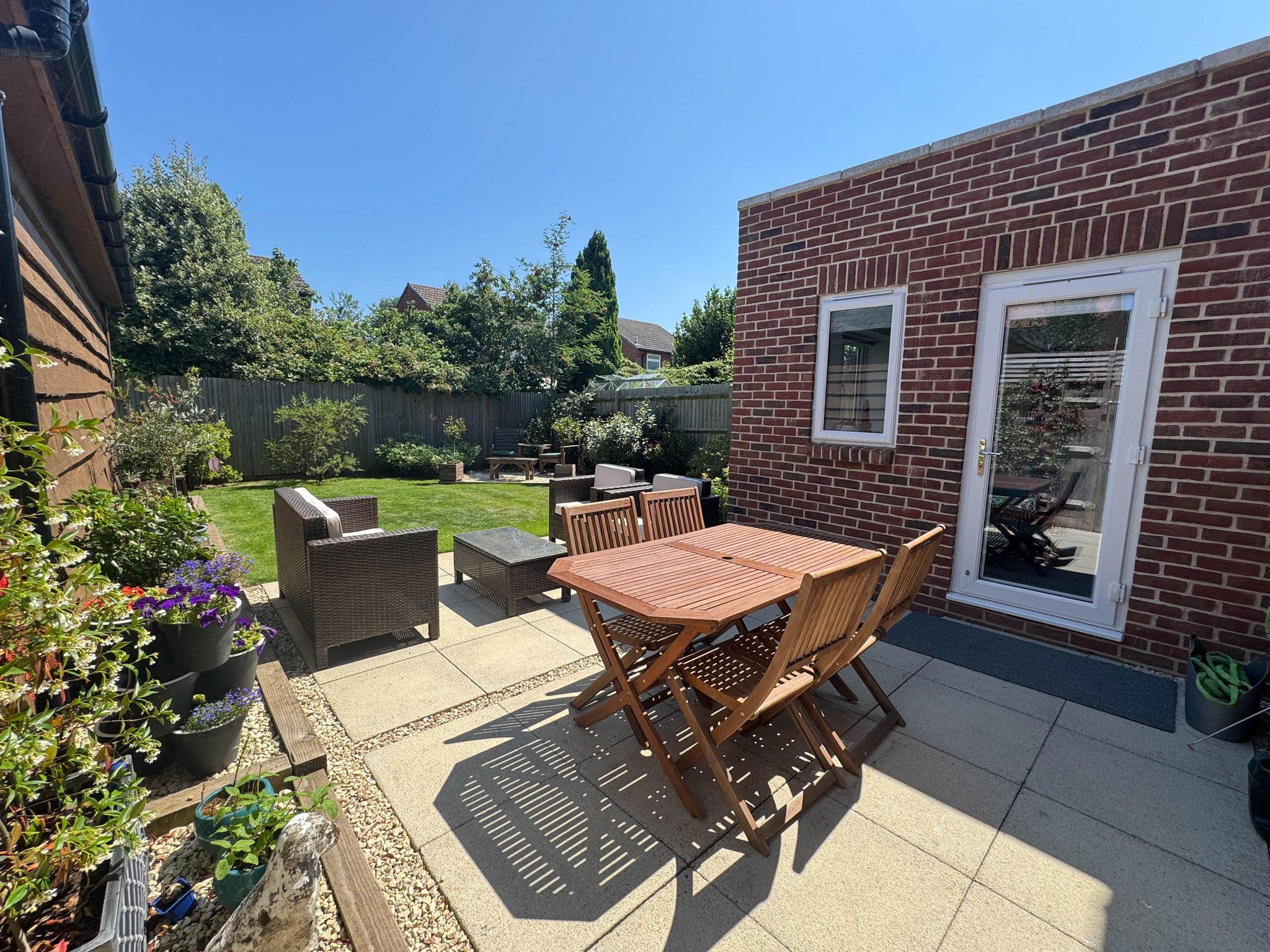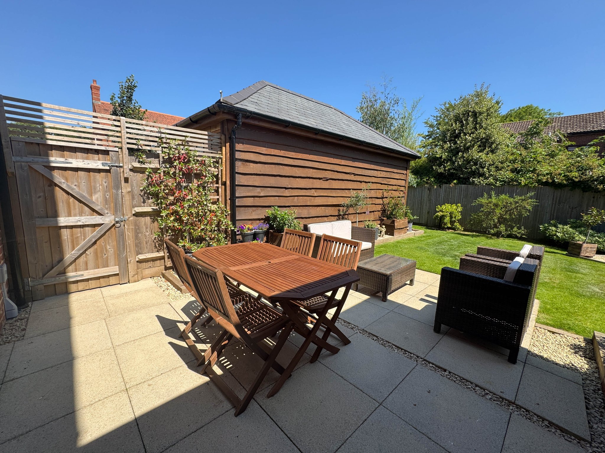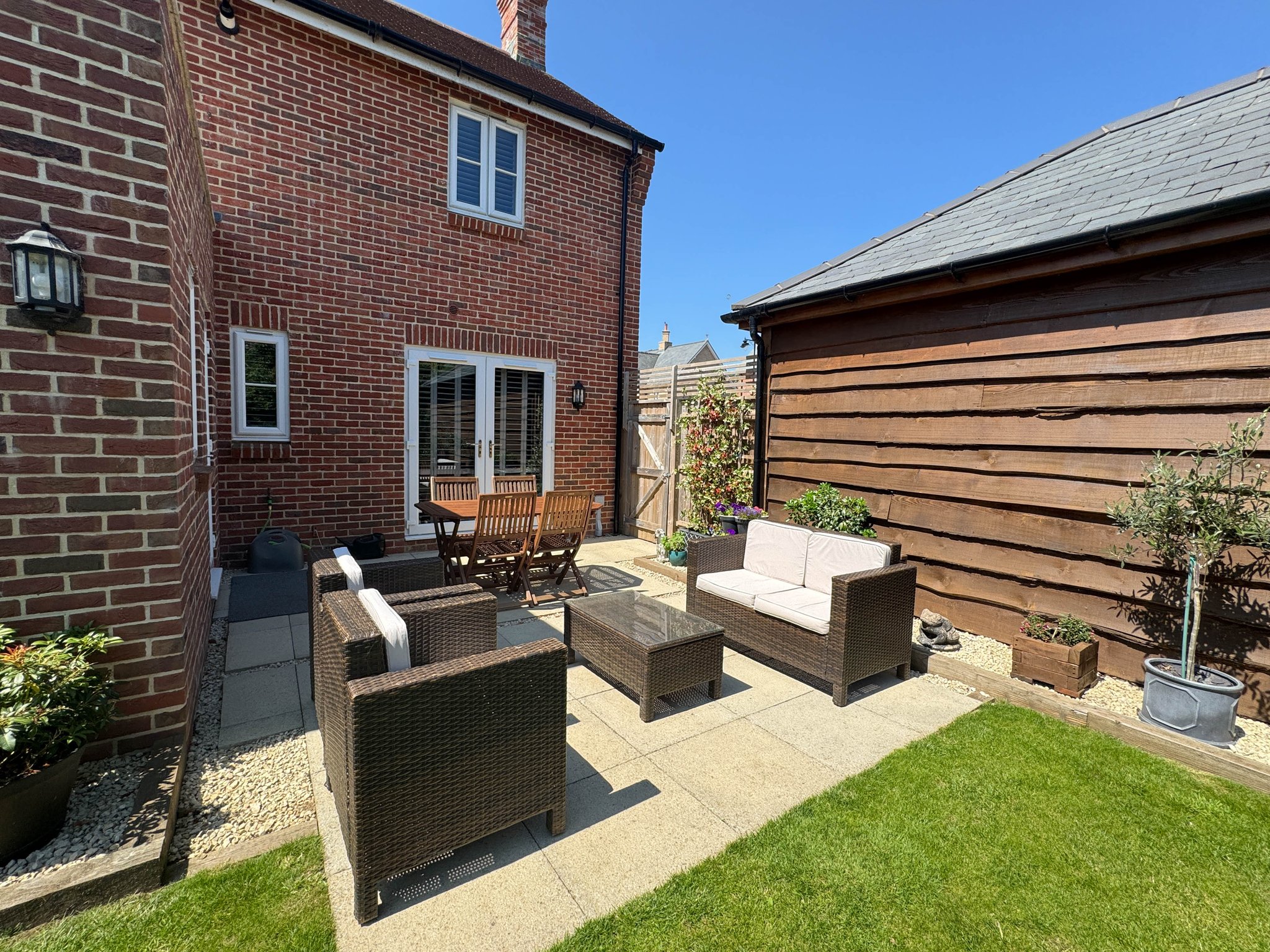 There is a dressed gravel driveway to the left hand side of the property which is suited to two vehicles parking in tandem and this in turn gives access to the detached garage with barn style doors. A garden gates denotes access to the rear garden which has been thoughtfully landscaped being predominantly laid to a kept lawn with stocked beds and a paved patio which spans the rear elevation of the home.